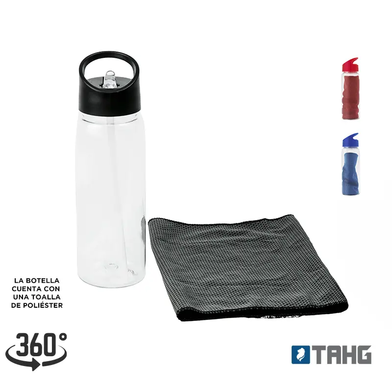 Botella deportiva fabricada en RPET con tapa de polipropileno. Cuenta con una toalla de poliéster, diseño ergonómico, tapa con sorbete y anillo para mejor agarre. Es ideal para entrenamientos, actividades al aire libre o jornadas deportivas intensas . Capacidad: 800 ml Dimensiones: 25.3 × 7.7 cm (diámetro) TAHG